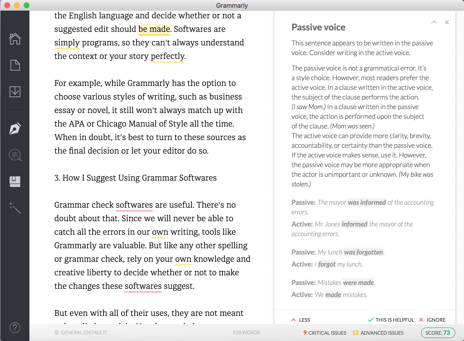 Not sure what a split infinitive is? Grammarly will not only look for those in your writing but also give you an explanation and suggest how to fix it. So, unlike word processors, it will actually explain the issues and guide you through the best option(s) to correct it.
